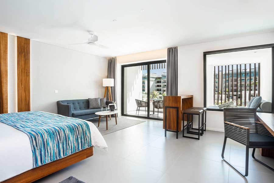 Garden or pool view given at random to the client, located 2nd, 3rd or 4th floor, with outdoor Jacuzzi and lounge bed. Living room and bedroom area are separated by doors. 1 king bed. 850 sq. ft.
